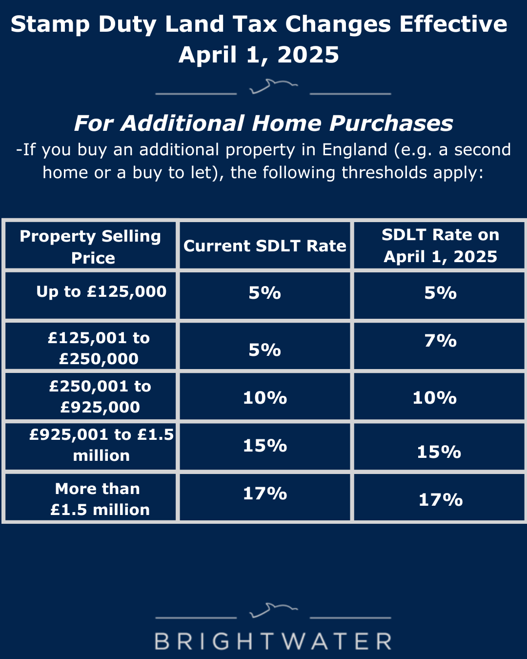 Those buying additional properties will pay 7% stamp duty for property values from £125,001 to £250,000, up from 5%.